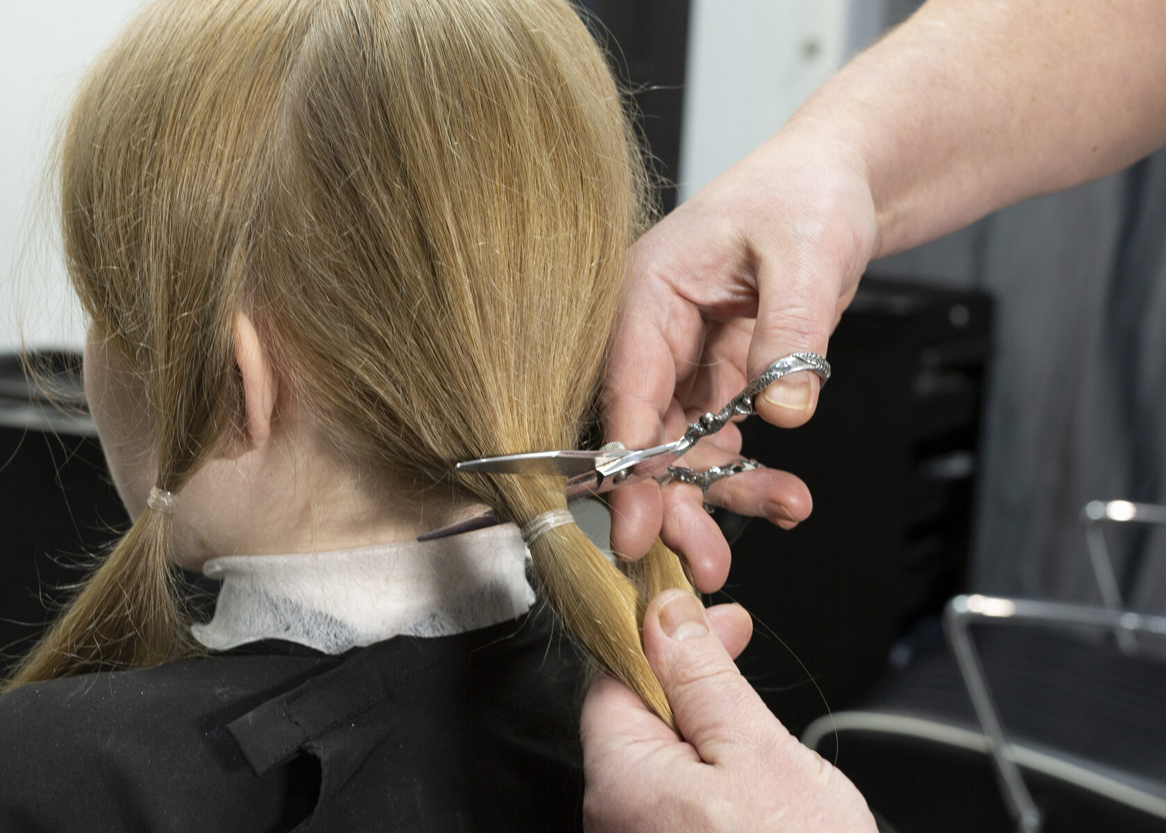5. Выполнение среза. Срезайте каждую прядь строго выше фиксирующей резинки, отступив от неё тот самый дополнительный сантиметр, заложенный для хвостика. Так вы гарантированно сохраните всю полезную длину.