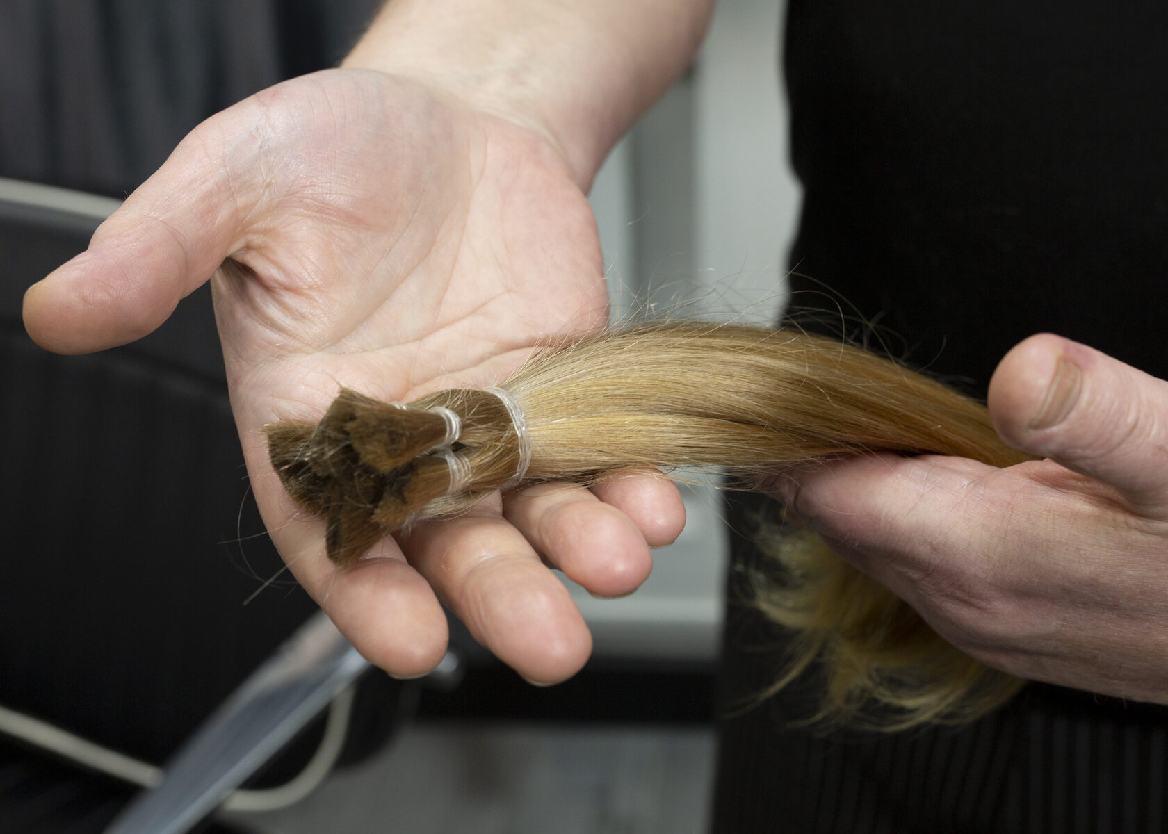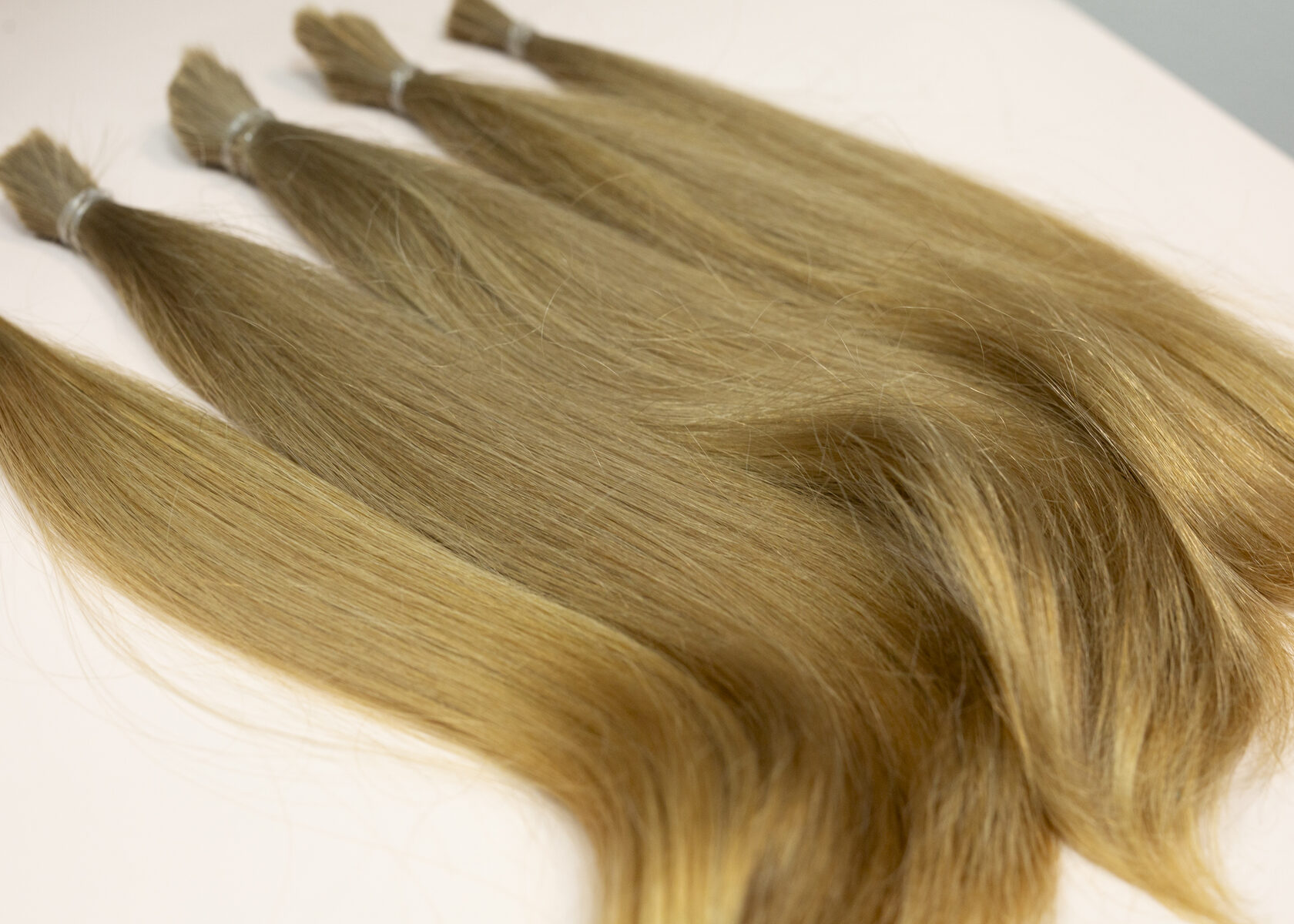 Если вы мастер и срезали волосы у клиента для создания индивидуального изделия, такой аккуратно собранный материал готов к профессиональной обработке: дезинфекции, сортировке и вплетению в тресс или созданию капсул для наращивания.